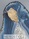 Šedomodrý achát s klasickou koncentrickou kresbou a křišťálovým středem.Silný a jednostranně leštěný volně stojící achátový plát s minimem růstových poruch. V horní části je zarostlý nažloutlý kalcit.