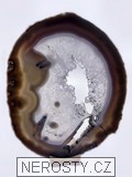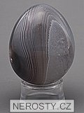 Pastelově bílo-šedo-modrý leštěný brazilský achát s výraznou koncentrickou kresbou.Podobně jako u brazilských ametystových geod je nepravidelný tvar kamene v místě podstavy doplněn betonem.