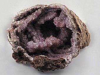 Velká a pěkně vybarvená marocká ametystová geoda.V šikmo otevřené dutině jsou narostlé světle fialové ametystové krystaly vytvářející pravoúhlé ploché agregáty. Na marocké poměry se jedná o obří geodu.