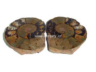 Prvohory, devon, stáří 385 - 345 milionů let.Zkamenělý amonit discoclymenia sp., rozříznutý a vyleštěný. Původní schránka amonita je impregnována limonitem, dutiny žeber jsou vyplněny kalcitem.