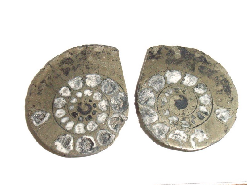 Původní schránka amonita je impregnována pyritem. Dutiny žeber jsou vyplněny krystalovaným kalcitem. |