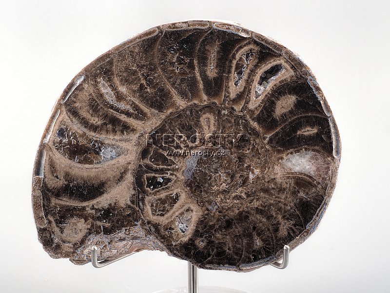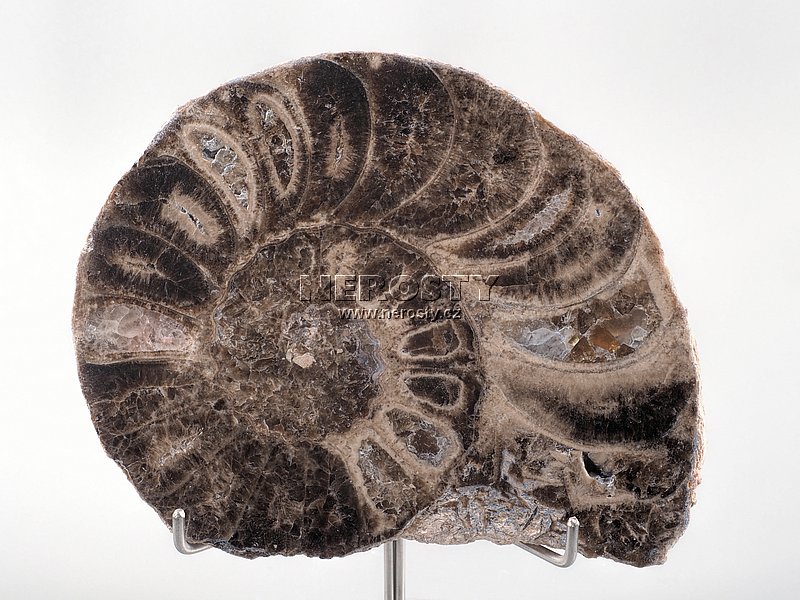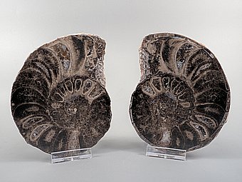 Na dvě poloviny rozříznutý a leštěný zkamenělý rohatý amonit mammites nodosoides.Druhohory, křída, stáří 135 - 70 miliónů let.