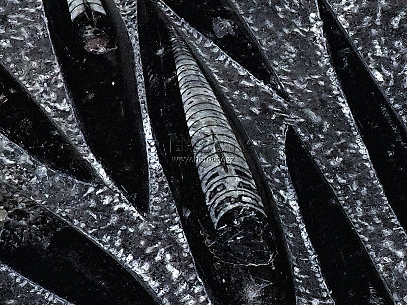 Plochá deska z černého vápence s množstvím leštěných zkamenělin. Prvohory, Devon, stáří 400 - 350 miliónů let. |