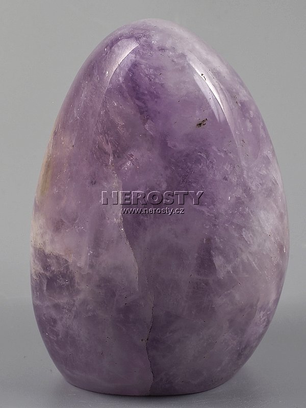 Volně tvarovaný leštěný kus nestejnoměrně probarveného levandulově fialového ametystu.Podstava je seříznuta a lze jej na ni postavit. Může sloužit i jako těžítko.