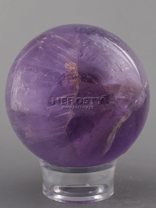 Sytě fialová, nestejnoměrně probarvená ametystová koule vybroušená z převážně čirého kusu krystalu. Výjimečná kvalita. |