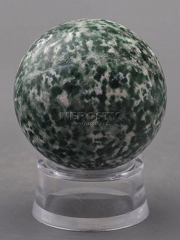 Zeleně kropenatá koule je vyrobena z kamene který je označován jako stromový achát. |