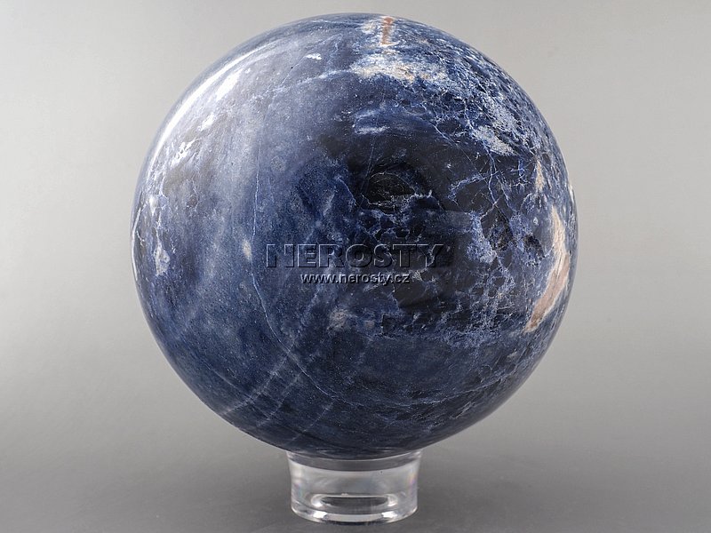 Koule z pěkně vybarveného kusu tmavě modrého sodalitu s vrostlicemi růžového granátu.Na povrchu jsou nepříliš výrazné, mělké, avšak hmatem dobře patrné nedokonalosti v opracování korespondující s přírodní porézností materiálu.