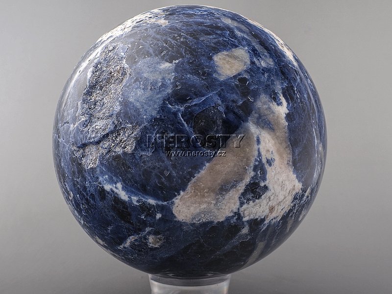Sytě zbarvená sodalitová koule s výraznou texturou a s nedokonale opracovaným povrchem.Na povrchu koule je několik větších prohlubní které nepůsobí rušivým dojmem. Díky nim je koule i bez podstavce stabilně stojící.
