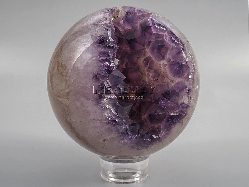 Chalcedonová koule s dutinou vyplněnou ametystovými krystaly.Ametystové krystaly mají matně fialové a zhruba 1 cm velké špičky. Koule je vyrobena z malé ametystové geody a je dobře průsvitná.
