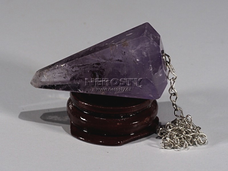 Kyvadlo z ametystu, vybroušeného do tvaru šestibokého jehlanu. Kyvadlo je zavěšeno na řetízku o délce cca 25 cm. |