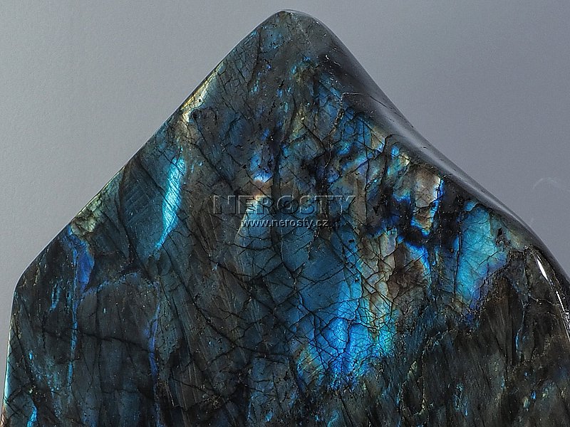 Vetší volně stojící leštěný kus labradoritu s výraznou modrou až místy zlatavou barvoměnou.Labradoritový blok je leštěný ze všech stran a má oblé hrany. Barvoměna je pouze na pohledové straně.