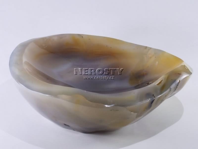 Dekorativní silnostěnná miska vyrobená z kusu volně tvarovaného drahého kamene. |