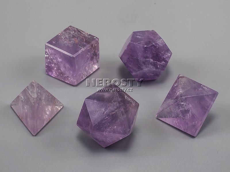 Platónská tělesa z nestejnoměrně probarveného ametystu.Pravidelný čtyřstěn (tetraedr), šestistěn (hexaedr), osmistěn (oktaedr), dvanáctistěn (dodekaedr) a dvacetistěn (ikosaedr). Symboly ohně, země, vzduchu, jsoucna a vody.