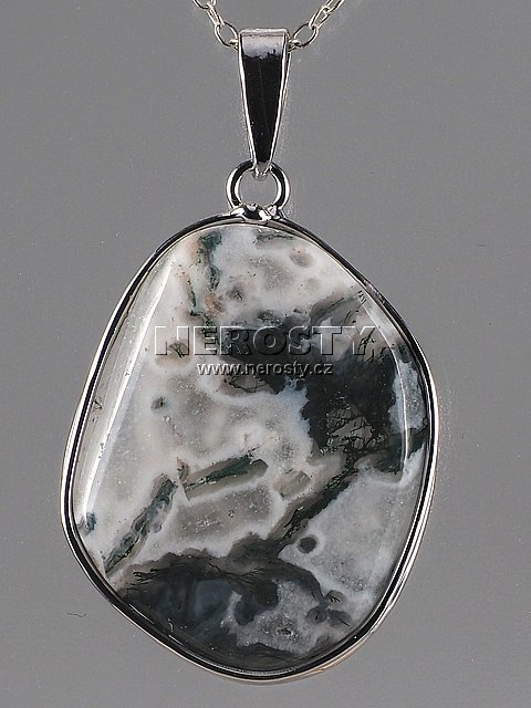 Přívěsek z mechového achátu s výraznou kresbou, originální šperk.Kámen je zasazen v obroučce z obecného, galvanicky postříbřeného kovu. Výšku uvádíme bez očka.