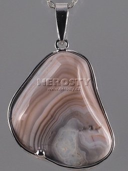 Přívěsek z pastelově narůžovělého achátu s klasickou koncentrickou kresbou, originální šperk.Kámen s přírodními prasklinami (které jsou reálně téměř neviditelné ale vyniknou dobře na fotografii) je zasazen v obroučce z obecného, galvanicky postříbřeného kovu. Výšku uvádíme bez očka.