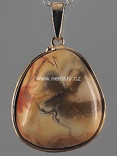 Přívěsek z achátu se zajímavou kresbou , originální šperk.Kámen s přírodními prasklinami (které jsou reálně téměř neviditelné ale vyniknou dobře na fotografii) je zasazen v obroučce z obecného, galvanicky pozlaceného kovu. Výšku uvádíme bez očka.