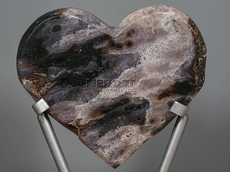 Velké dekorativní ploché achátové srdce (rozměr kamene 13.5 x 15 x 3.5 cm) osazené do kovového podstavce.Srdce lze z podstavce vyjmout. Povrchová úprava kovového stojanu odpovídá brazilskému standardu a je nedokonale provedená. Naskýtá se zde možnost nabarvit si podstavec lépe a jiným odstínem barvy který vám bude lépe vyhovovat.