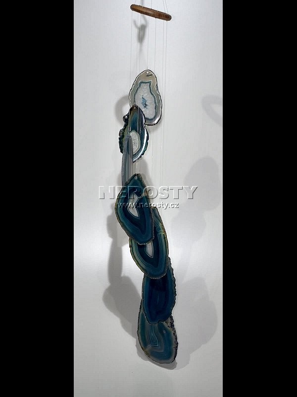 Zvonkohra z přibarvených achátových plátků.Zvonkohra je vyrobena z přibarvovaných, původně šedých až béžových, achátových plátků. Vzhledem k tomu, že jejich pestré barvy na slunci blednou, nedoporučujeme její zavěšení na osluněné místo.