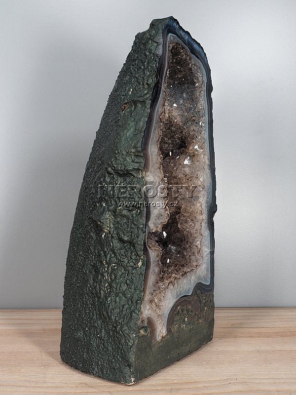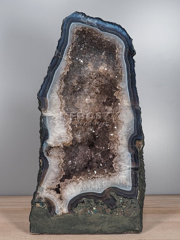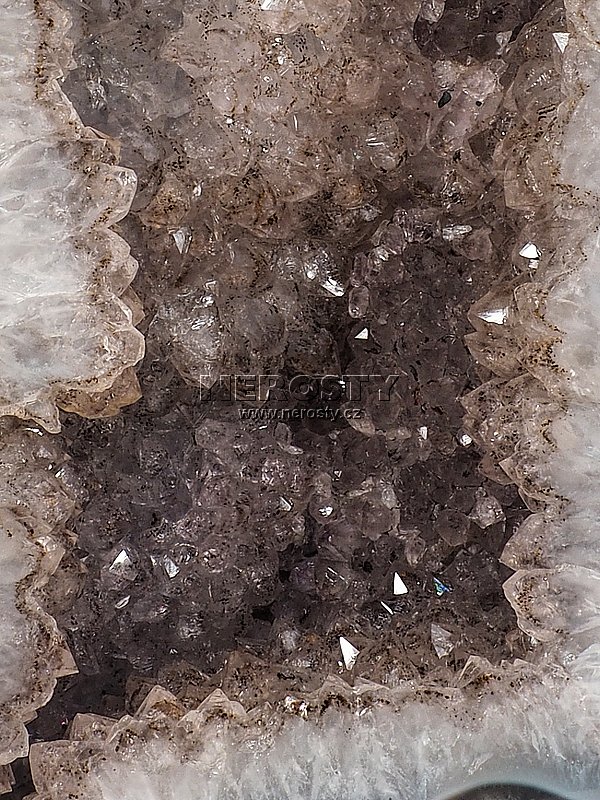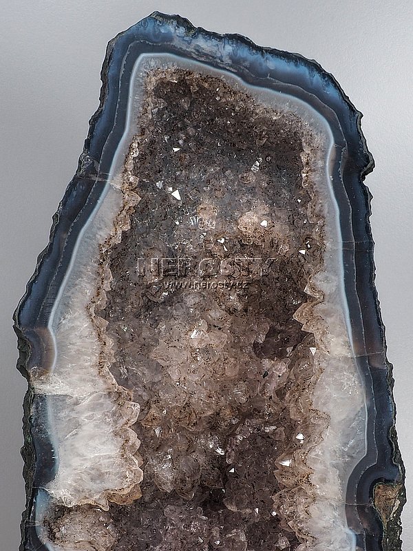 Křišťálová geoda lemovaná achátovým okrajem.Úzký achátový lem přechází v bílý křemen a následně v čirý křišťál. Hnědavé zbarvení křišťálových krystalů je způsobeno jehličkami goethitu zarostlými těsně pod povrchem až 1,5 cm velkých špiček.