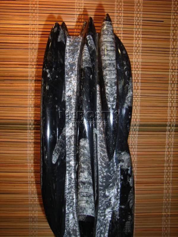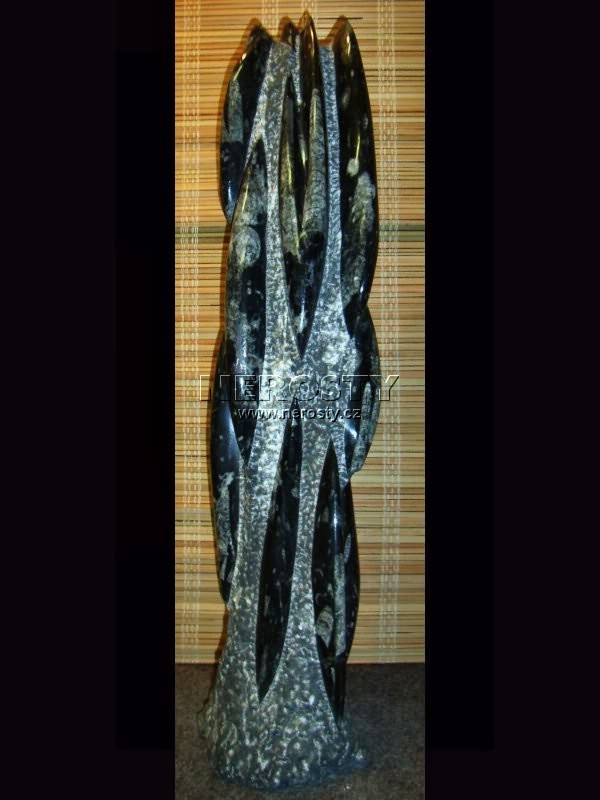 Obelisk (věž, jehla) vyrobený ze vzácného druhu mramoru se zarostlými zkamenělinami (ortoceras, amonit). Jejich stáří je 400 - 350 miliónů let. Prvohory, Devon.Originální ruční práce. Povrch je upraven sekáním a leštěním.