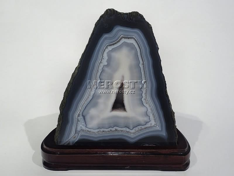 Klasický leštěný braziský achát s dobrou kresbou a s minimem prasklin, osazený v dřevěném podstavci. |