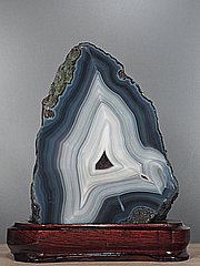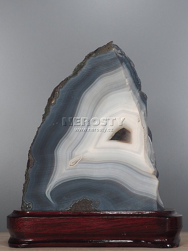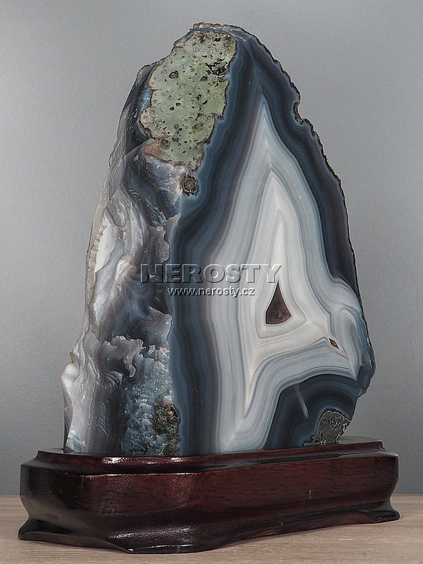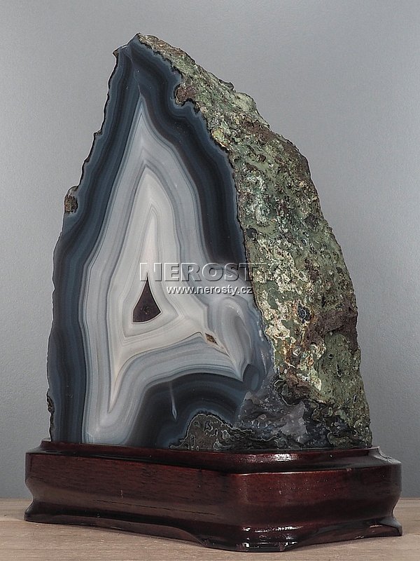 Silný jednostranně leštěný achátový plát s výraznou kresbou.Achát je osazený v dřevěném podstavci, rozměry uvádíme včetně něj.