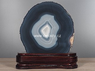Klasický leštěný brazilský achát - část pecky s dobrou kresbou a s minimem prasklin.Achát je osazený v dřevěném podstavci, rozměry uvádíme včetně něj.