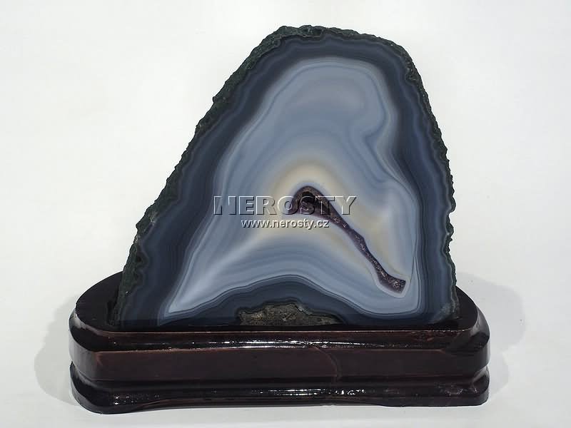 Klasický leštěný braziský achát s dobrou kresbou a s minimem prasklin, osazený v dřevěném podstavci. |