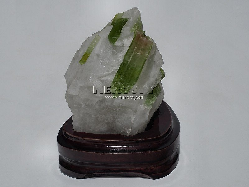 Několik krystalů jedovatě zeleného elbaitu – verdelitu zarostlých v čistě bílem křemeni. Největší krystal měří 5 cm. Kontrastní vzorek. |