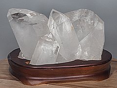 Drúza až 9 cm dlouhých, silných a krásně rostlých krystalů křišťálu.Součástí dodávky je podstavec z tmavě hnědého dřeva ze kterého lze kámen vyjmout.