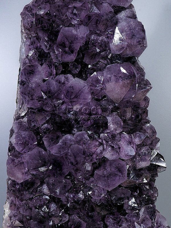 Vysoká drúza pěkně rostlých a nepoškozených velkých fialových krystalů ametystu osazená v dřevěném podstavci 37 x 24 cm.Nádherný interiérový doplněk vhodný i pro opravdu náročné klienty.