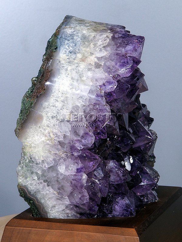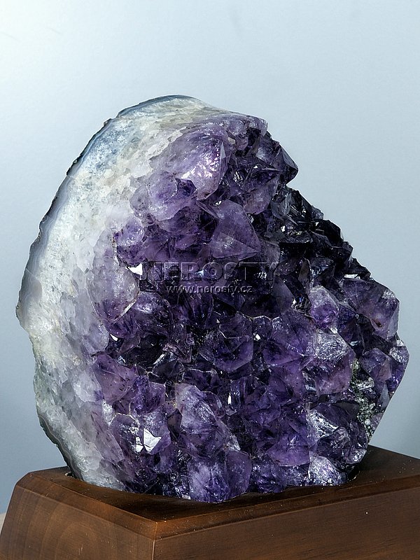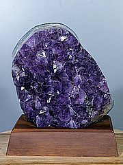 Drúza pěkně rostlých fialových krystalů ametystu. Okraje drúzy jsou leštěné.Kámen je vsazen do dřevěného podstavce o rozměru 17 x 13 cm.