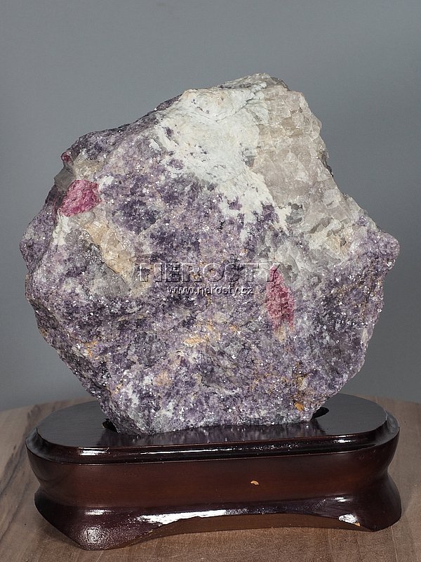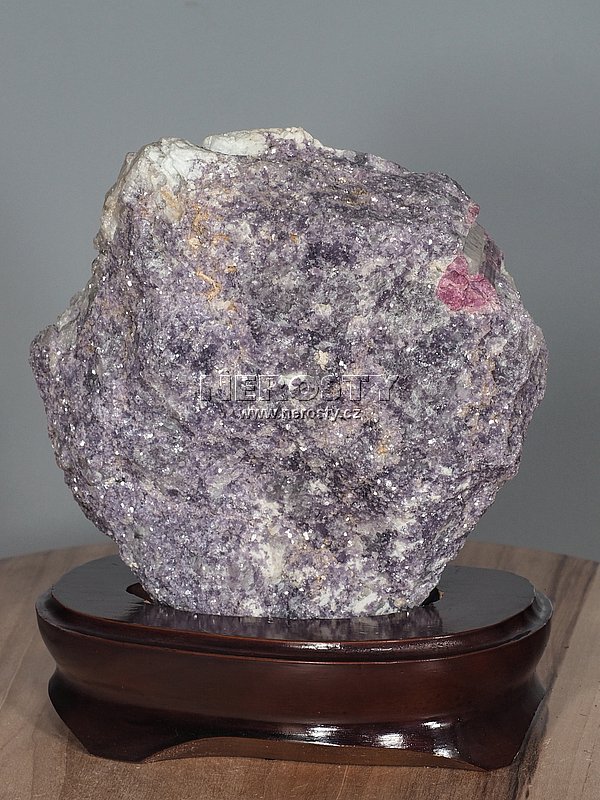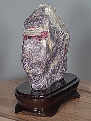 Dekorativní kámen zasazený v lakovaném dřevěném podstavci.Podstavec vykazuje drobné nedokonalosti ve zpracování povrchu včetně oděrek laku. Rozměry a hmotnost uvádíme včetně podstavce.