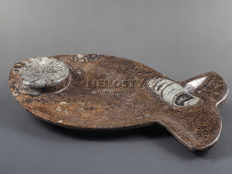 Dekorativní předmět a zároveň funkční bytový doplněk z kamene s originálním vzorem a vybarvením. Materiálem jsou mořské prvohorní usazeniny plné fosilií (goniatit, amonit, ortoceras) z období devonu, staré 400 - 350 miliónů let. Výrazný goniatit v centrální části misky je před zpracováním ke kameni přilepen a následně vyleštěn spolu s miskou.