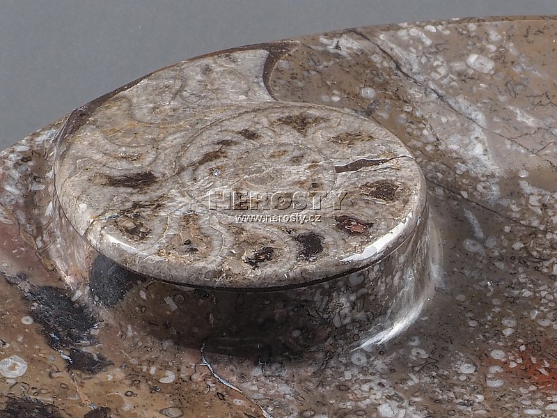 Originální oválná mistička vyrobená z kusu mořské prvohorní usazeniny plné fosilií.Dekorativní předmět a zároveň funkční bytový doplněk z kamene s originálním vzorem a vybarvením. Materiálem jsou mořské prvohorní usazeniny plné fosilií (goniatit, amonit, ortoceras) z období devonu, staré 400 - 350 miliónů let. Výrazný goniatit v centrální části misky je před zpracováním ke kameni přilepen a následně vyleštěn spolu s miskou.