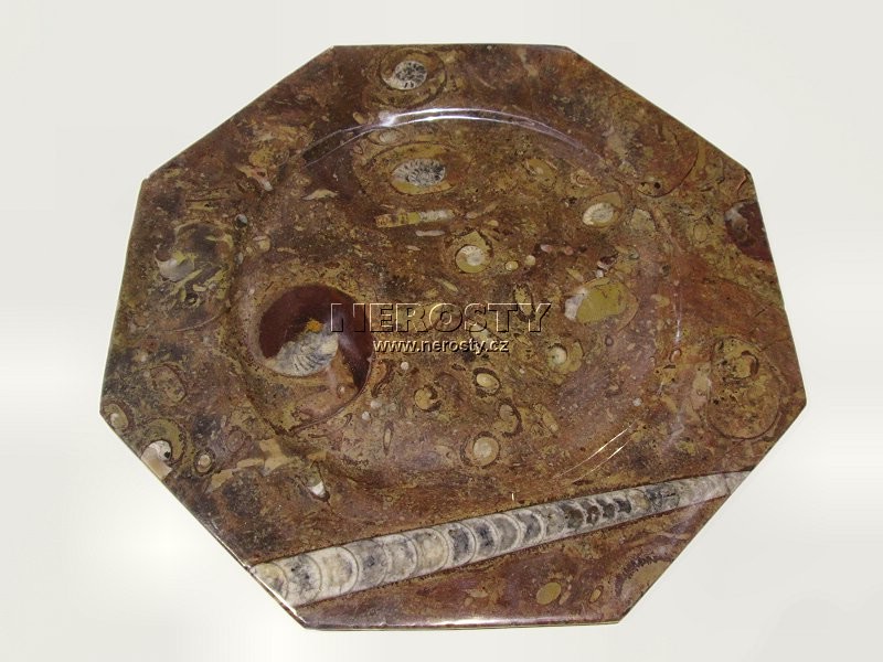 Dekorativní předmět z kamene s originálním vzorem a vybarvením. Materiálem jsou mořské prvohorní usazeniny plné fosilií (amonit, ortoceras) z období devonu, stářé 400 - 350 miliónů let. |