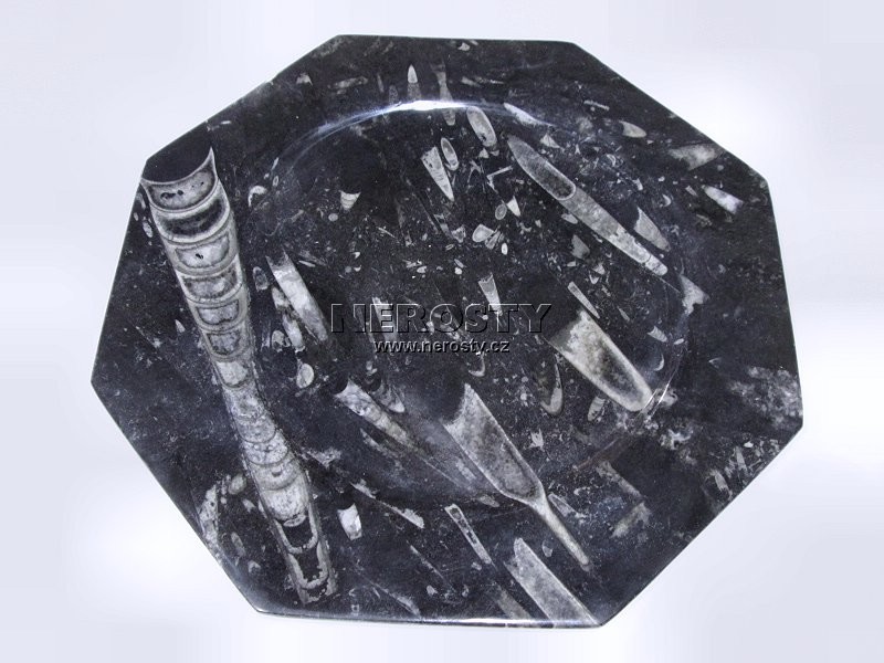 Dekorativní předmět z kamene s originálním vzorem a vybarvením. Materiálem jsou mořské prvohorní usazeniny plné fosilií (amonit, ortoceras) z období devonu, stářé 400 - 350 miliónů let. |