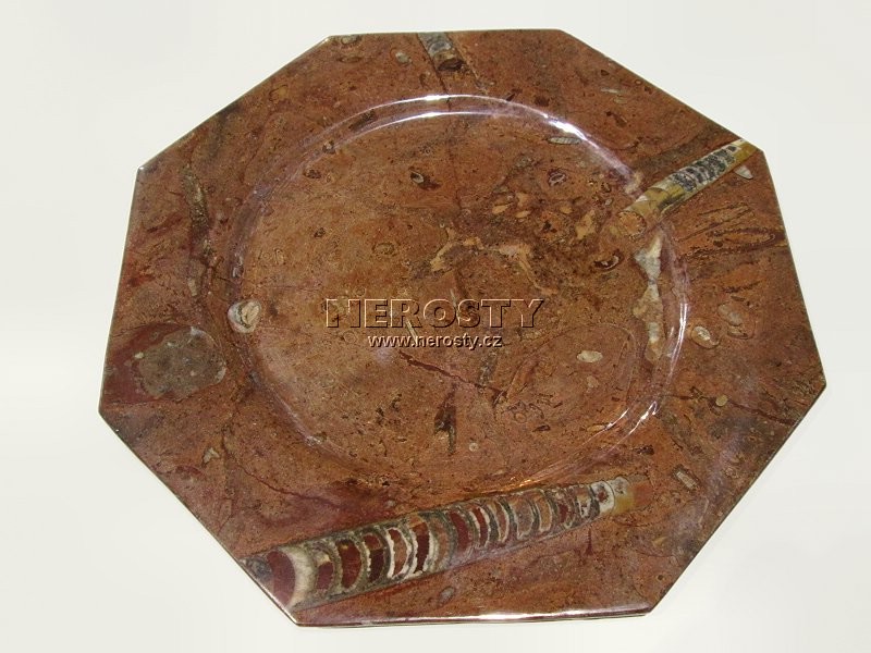 Dekorativní předmět z kamene s originálním vzorem a vybarvením. Materiálem jsou mořské prvohorní usazeniny plné fosilií (amonit, ortoceras) z období devonu, stářé 400 - 350 miliónů let. |