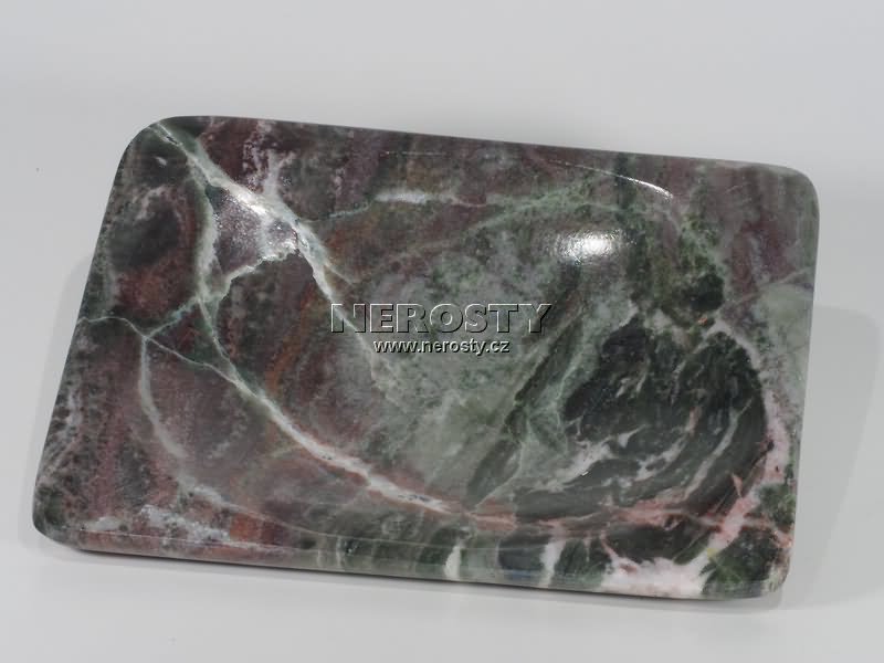 Talířek z kamene s originálním tvarem, vzorem a vybarvením.