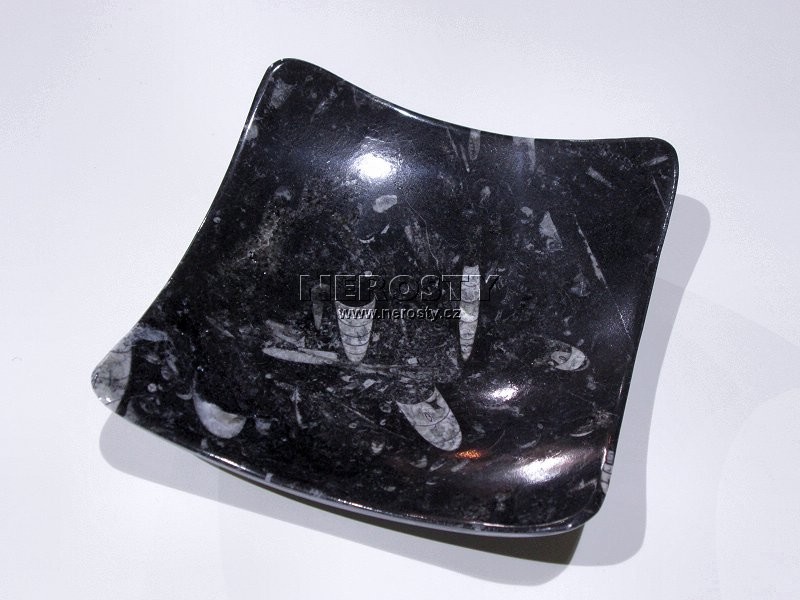 Dekorativní předmět z kamene s originálním vzorem a vybarvením. Materiálem jsou mořské prvohorní usazeniny plné fosilií (amonit, ortoceras) z období devonu, stářé 400 - 350 miliónů let. |