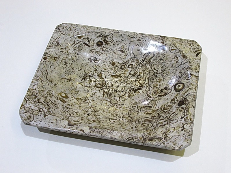 Dekorativní předmět z kamene s originálním vzorem a vybarvením. Materiálem jsou mořské prvohorní usazeniny plné fosilií. |