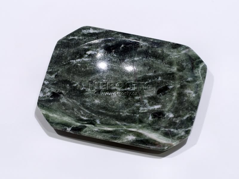 Miska ze zeleného až šedozeleného mramoru s červeným žilkováním. Dekorativní předmět z kamene s originálním vzorem a vybarvením. |