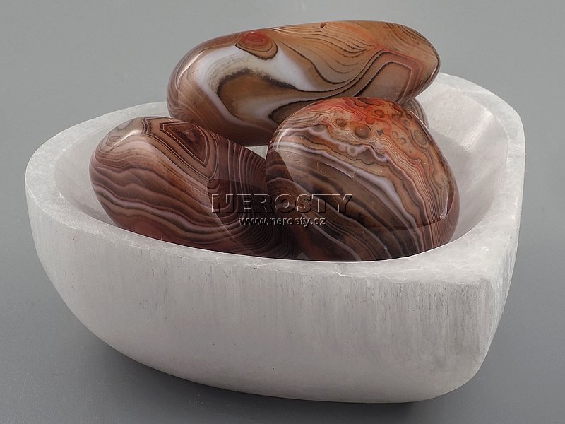 Miska ve tvaru srdce vyrobená z leštěného selenitu.Pro názornost jsou na jedné z fotografií do misky vloženy valouny z achátu. Ty ale nejsou součástí dodávky.