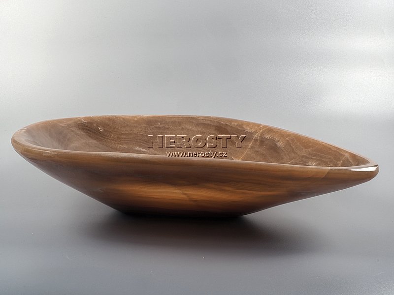 Dekorativní mísa z béžového aragonitu s jemnou koncentrickou kresbou.Aragonit je vysrážený z vodního pramene a jeho typický pruhovaný vzor vzniká především střídáním chemického složení a změnami vydatnosti pramene.