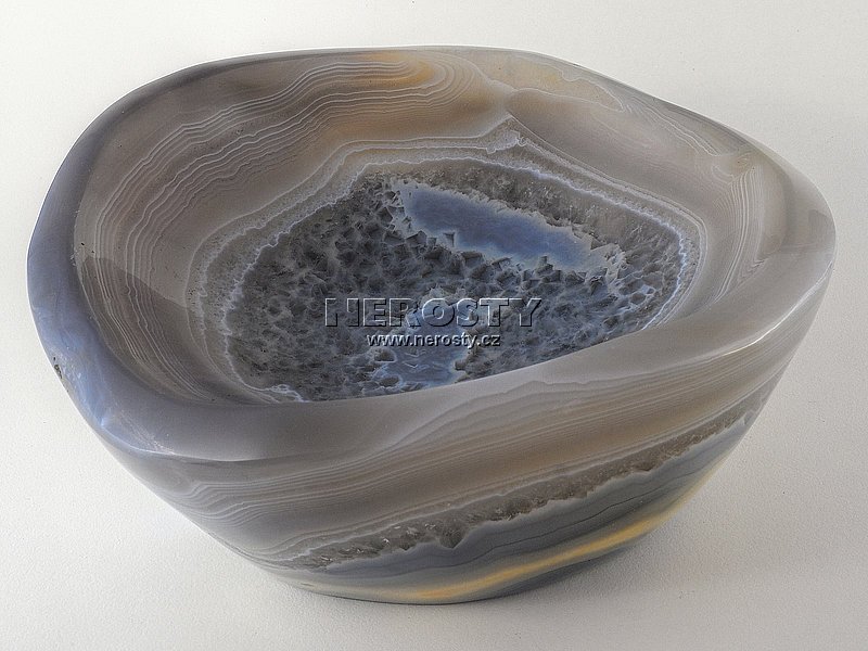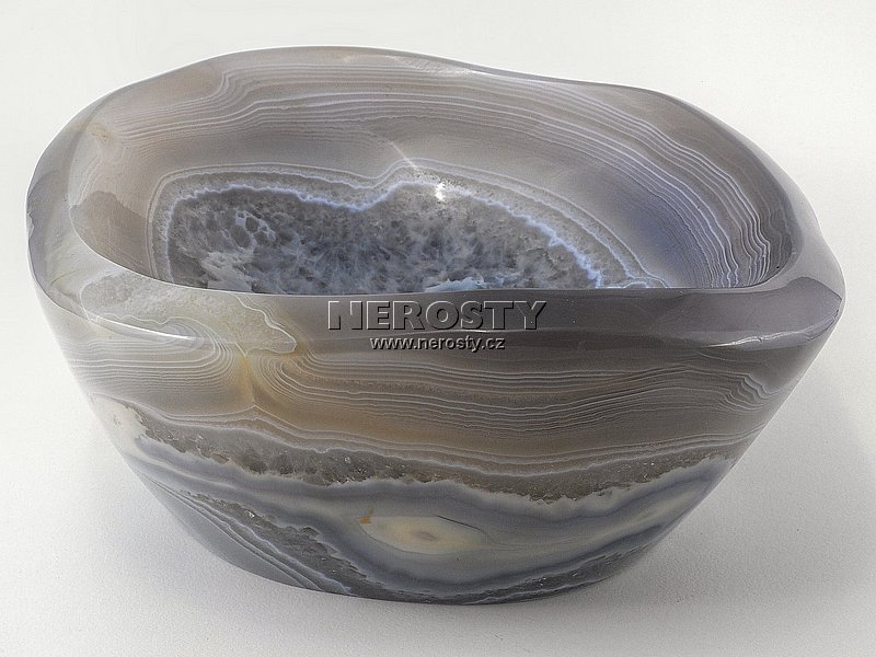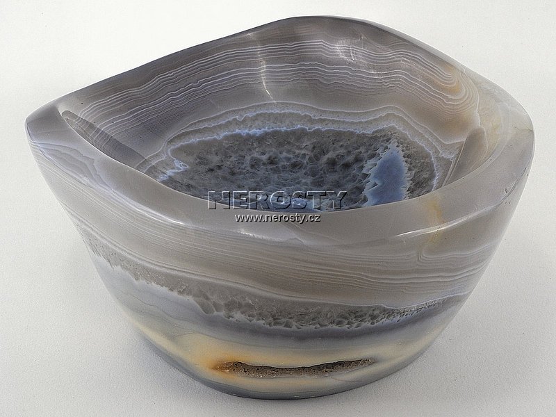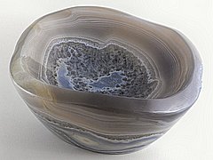 Silnostěnná miska vyrobená z kusu achátu s pěknou kresbou. |