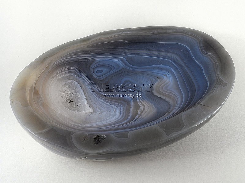 Silnostěnná miska vyrobená z kusu achátu s pěknou kresbou. |
