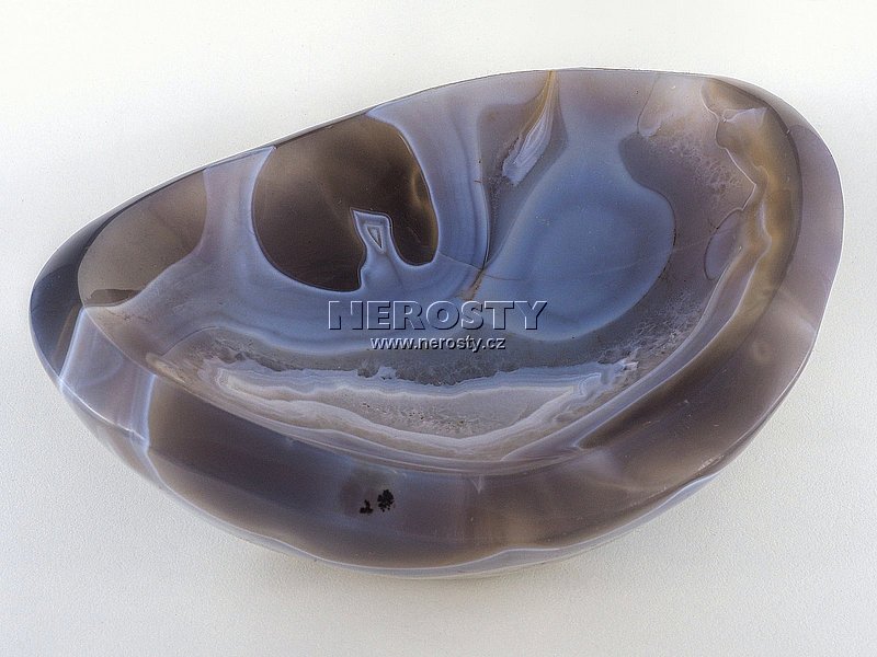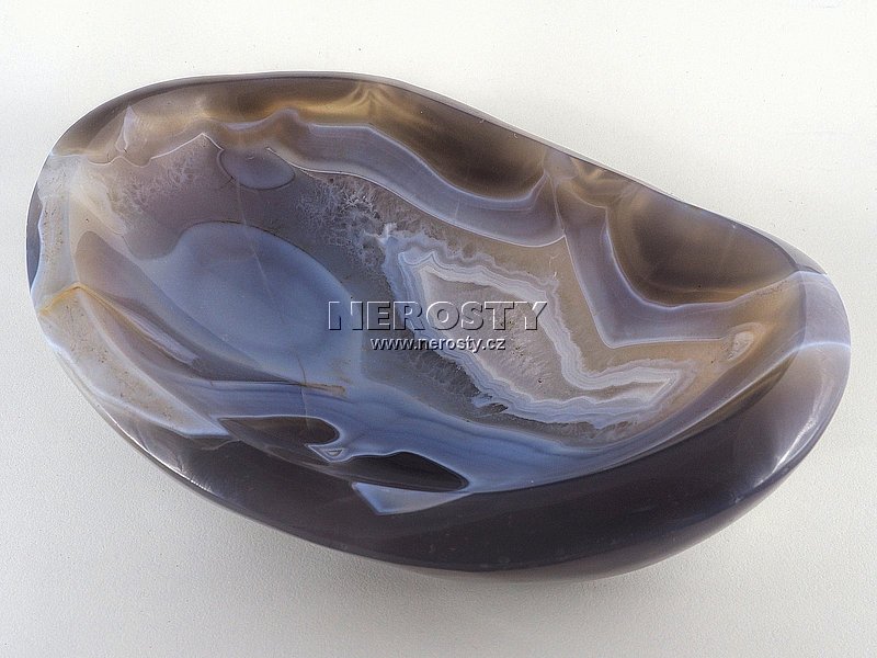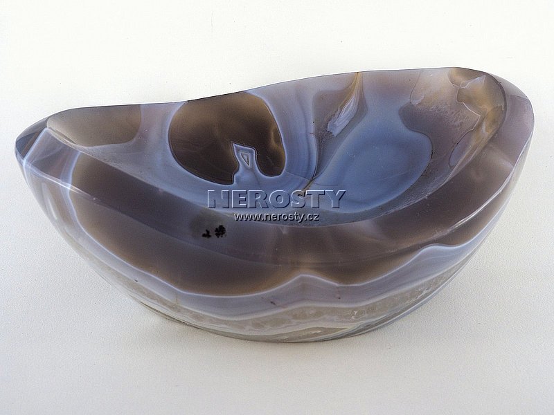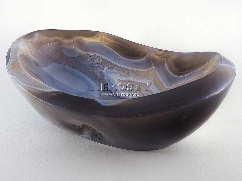 Silnostěnná miska vyrobená z kusu achátu s pěknou kresbou. |