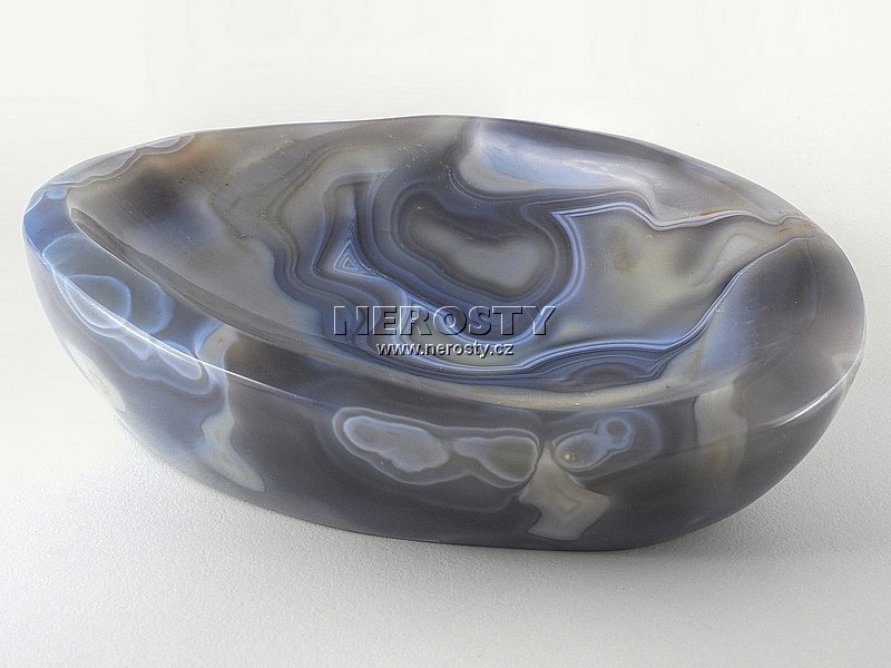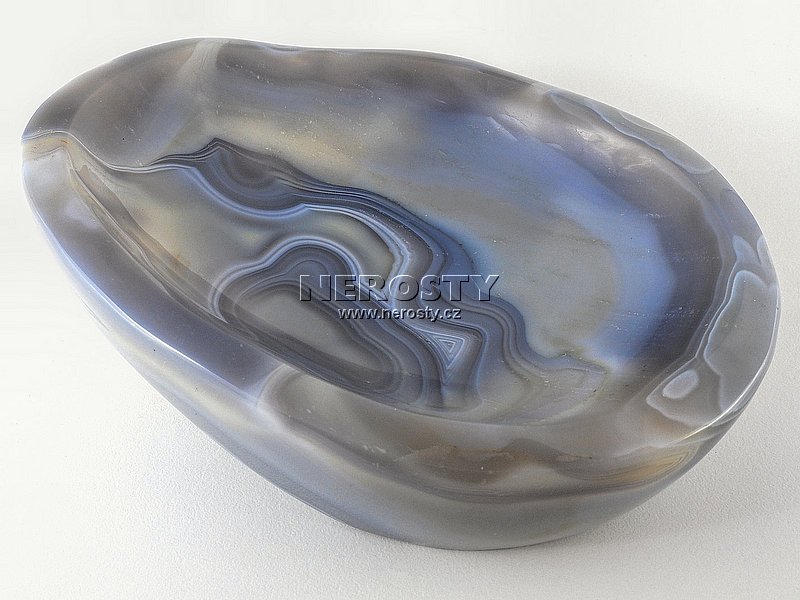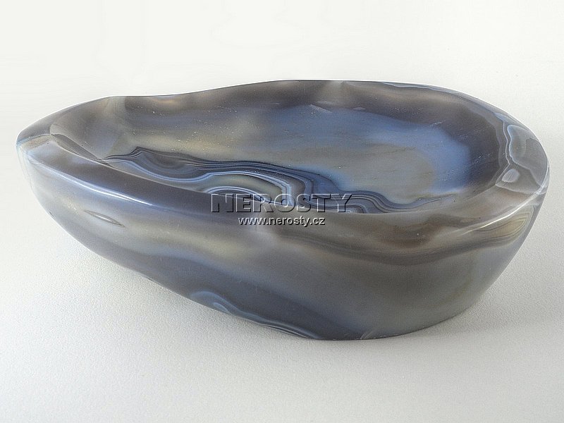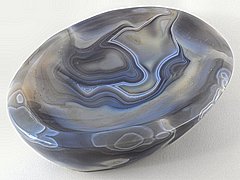 Silnostěnná miska vyrobená z kusu achátu s pěknou kresbou. |