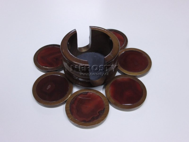 Barvené achátové plátky v kombinaci s ušlechtilým dřevem. Průměr podložek pod šálky je 7,3 cm. |