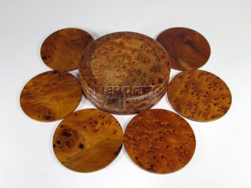 Podšálky z cedrového dřeva. Kolečka se musí do držáku kvůli nepřesnostem ve zpracování ukládat v takovém pořadí jak jsou naskládány od výrobce.Sada vykazuje typické znaky ruční práce, drobné nepřesnosti, problémy s lícováním, praskliny v materiálu atd. Je to krásny předmět pro ty, kteří chtějí cítit teplo lidských rukou a naprosto nevhodný pro ty, kteří touží po strojové dokonalosti ...